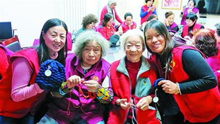 12月25日下午,青岛市南区金门路街道老年人日间照料中心内很是热闹,金门路街道4S党员社区服务队的爱心陪伴志愿者们正在与老人一起有说有笑地织着毛线帽。
